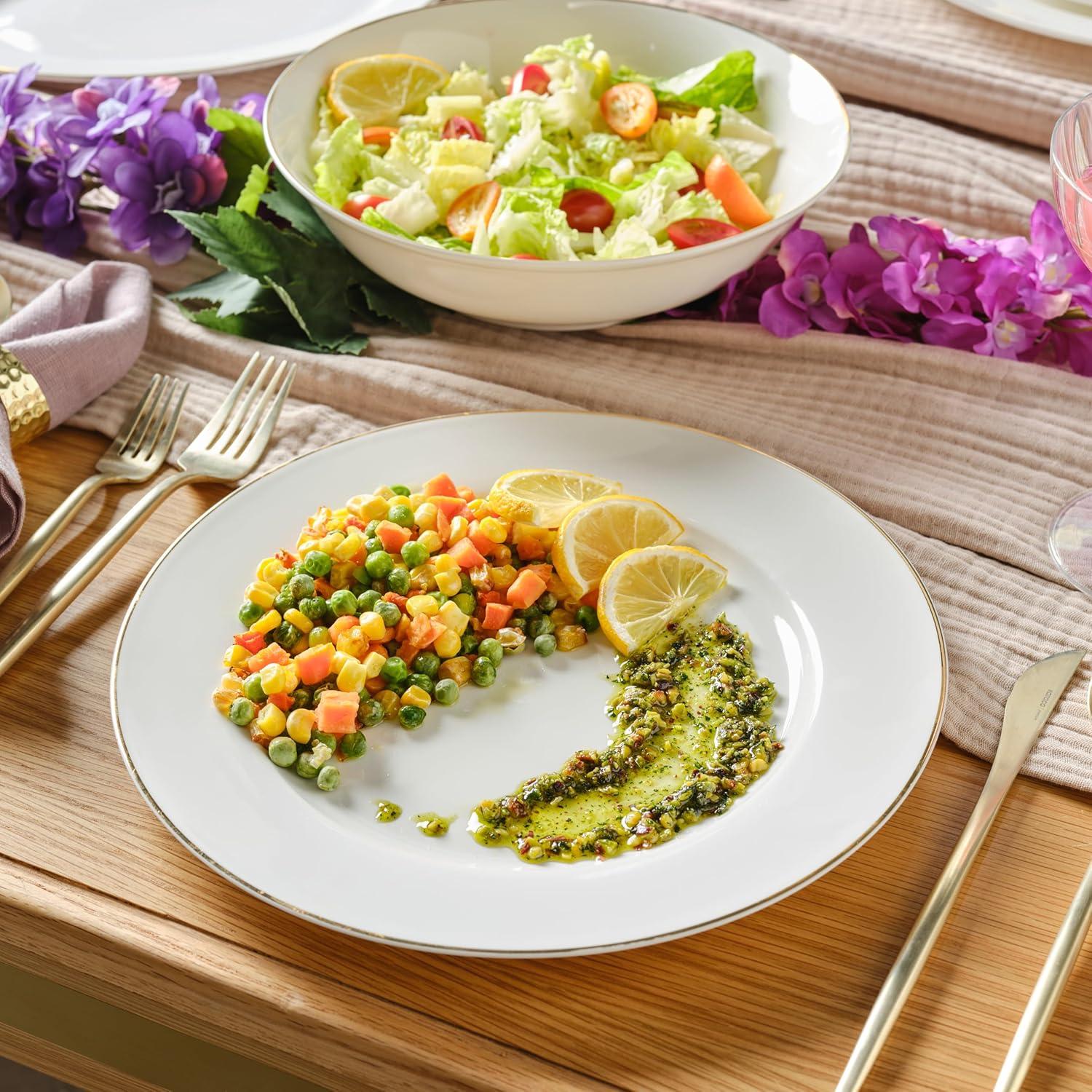 Welcome to our collection of 32 porcelain plates that will elevate and elevate your dining affair (and your Instagram feed). Lightweight and effortless to handle, these dishes are perfect for any mood or occasion. The sleek design with a hint of gold adds a touch of elegance and contemporary flair to your dining experience. With easy clean-up, you'll have more time to savor your delicious meals. Upgrade your table setting and impress your guests with our "Kitchenkey" stamped plates. Perfect for serving all types of delicious Egyptian cuisine.