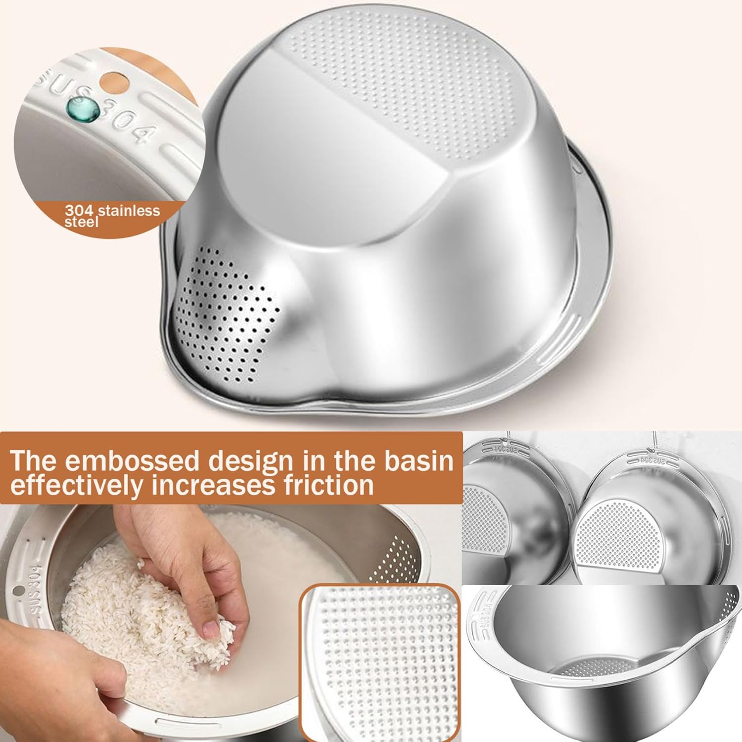Make meal prep a breeze with our Rice Washer Strainer Bowl. This 4-in-1 washing bowl is perfect for quinoa and fruits, with a side drain and V-shaped bottom colander for easy cleaning. Crafted from durable stainless steel and featuring a convenient hanging hook, it's a must-have for any kitchen.