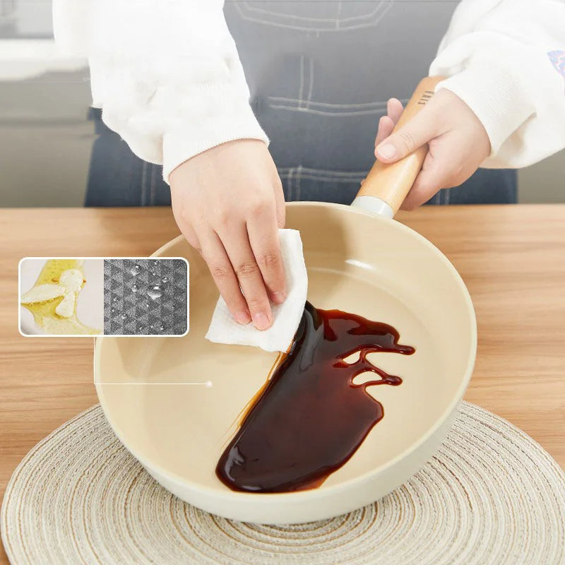 SCANDI STYLE WINNER 2020 Scandinavian-inspired design featuring smooth rounded edges, a chic combination of matte cream exterior and glossy sandy interior, a sleek oval handle with non-slip wood grip, and a snug-fitting lid with a matching silicone rim for quiet and precise closure.